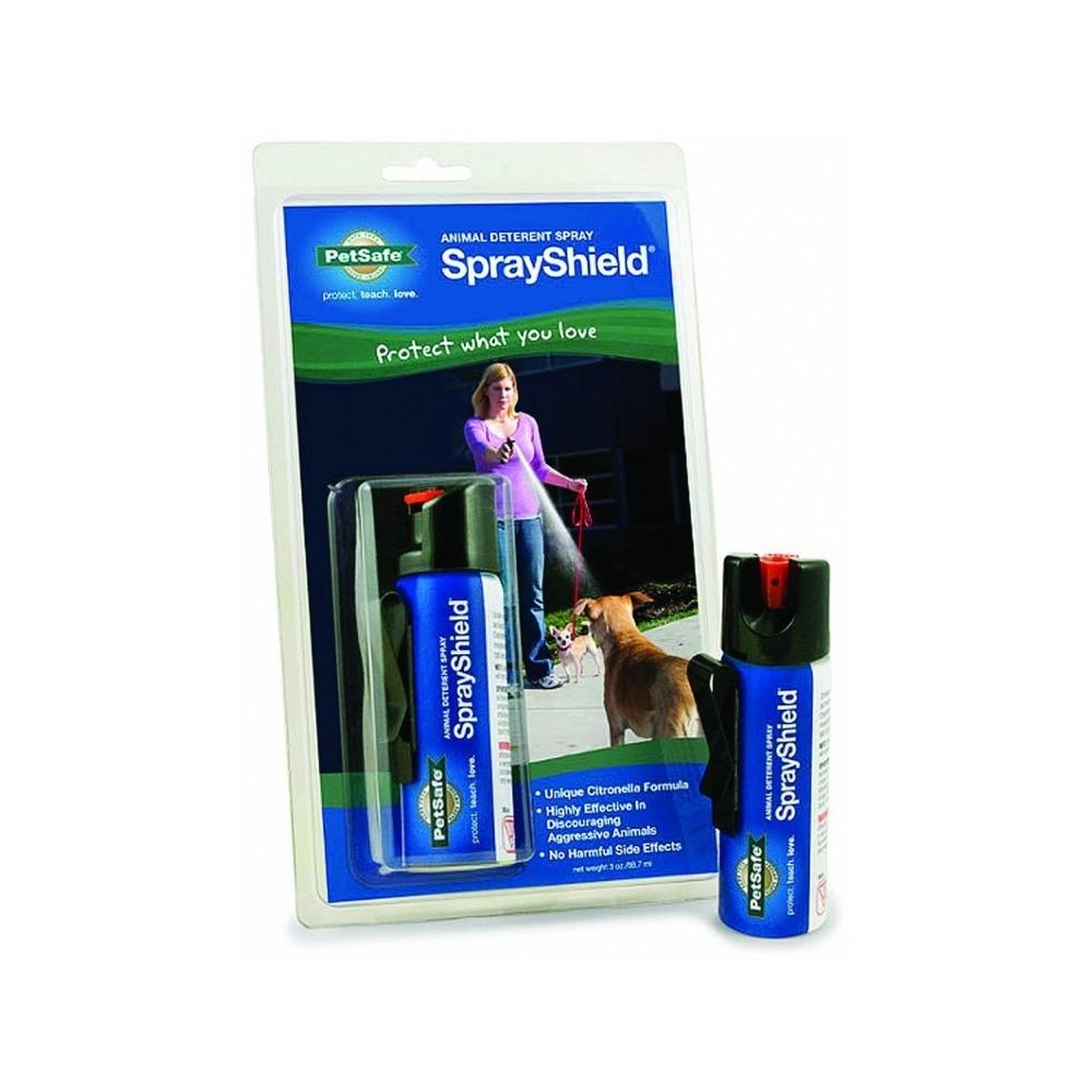 Spray Shield Animal Deterrent spray is a citronella formula halts low-to medium level aggression from dogs, cats, snakes, etc. No harmful side effects. This is a compact can with a handy belt/pocket clip. Perfect for those who may walk with or encounter aggressive animals. Contains enough formula to spray up to 10-foot stream for up to 12 seconds.