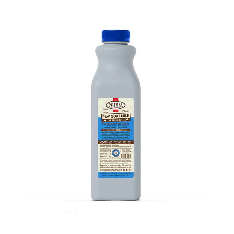於美國製造,不含穀物、麩質、豆類或人工添加物,Primal 的藍莓生山羊奶是每日寵物營養補給的天然之選。