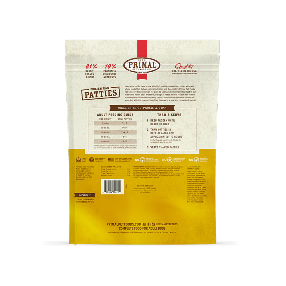 The Primal Frozen Raw Rabbit Dog Food offers a complete and balanced diet in convenient frozen patties, perfect for large-breed dogs and multi-dog families. Made in the USA with farm-raised, antibiotic-free rabbit raised without steroids or added hormones, this recipe delivers clean protein with natural goodness.