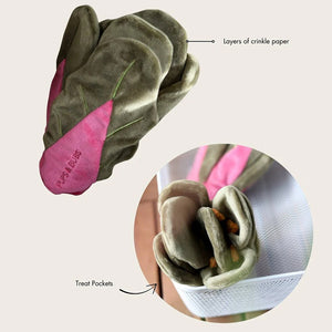 Designed for more than one style of play, this toy also includes crinkly paper and multiple treat pockets to provide extra sensory fun. The soft plush texture is gentle on noses and mouths, while the beautiful vegetable-inspired design and earthy neutral colours make it a charming addition to any home.