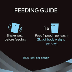Shake well before use. Feed one pouch per 2kg of body weight per day to adult cats. For additional guidance, consult your veterinarian.
