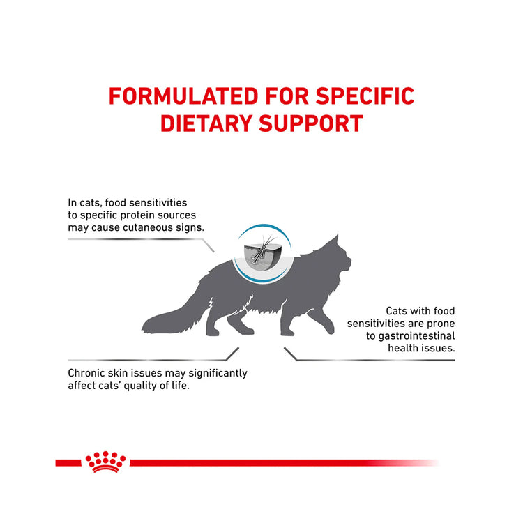 ROYAL CANIN® Veterinary Health Nutrition Anallergenic is a veterinary-exclusive diet designed to nutritionally support adult cats with severe food allergies or intolerances. This diet is recommended for cats with Adverse Food Reactions (AFR) showing dermatological and gastrointestinal signs, as well as conditions such as Feline Atopic Dermatitis (CAD) and Inflammatory Bowel Disease (IBD).