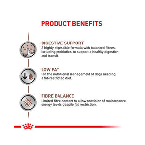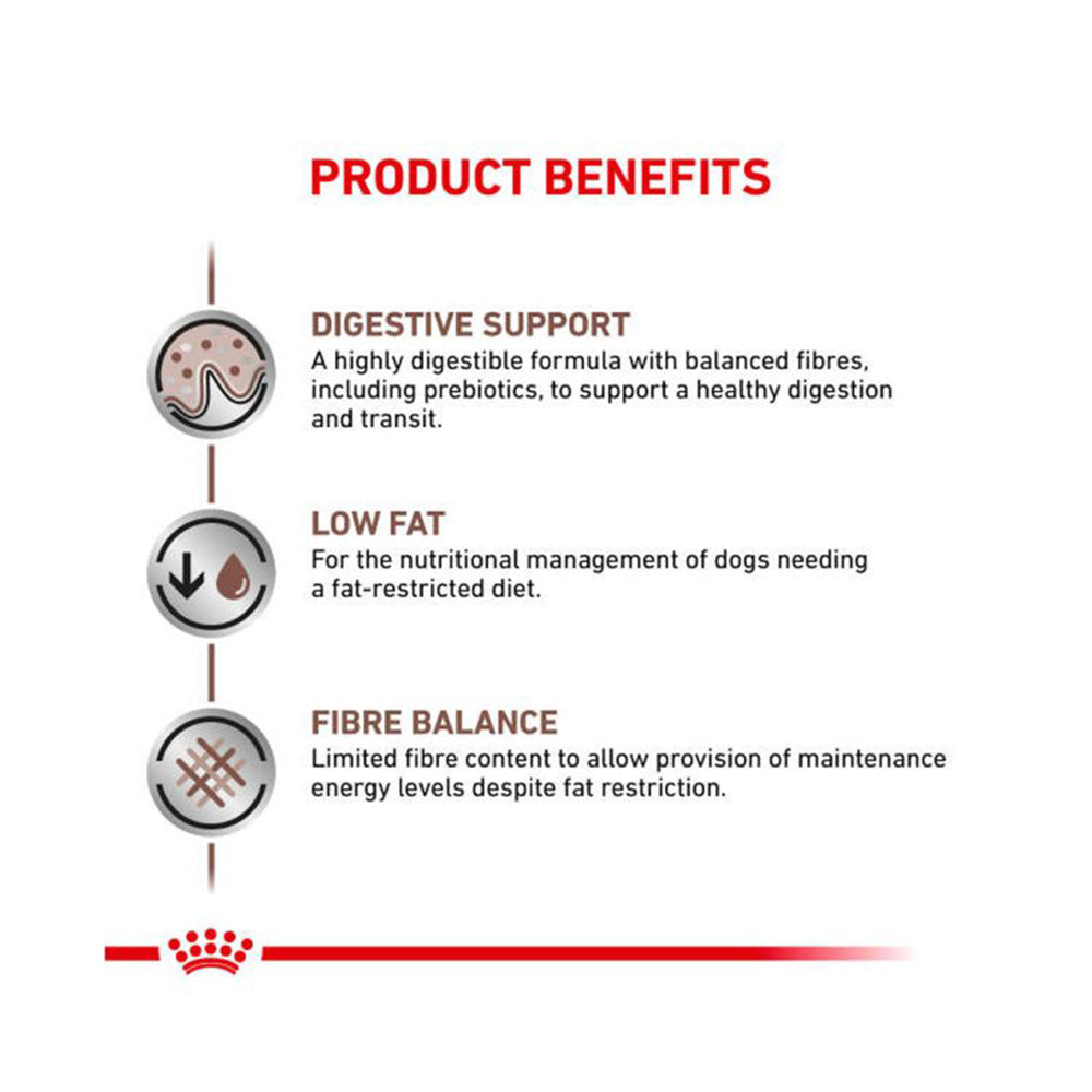 ROYAL CANIN® Veterinary Health Nutrition Gastrointestinal Low Fat is a complete and balanced veterinary diet designed to nutritionally support adult dogs requiring a fat-restricted diet. This formula is indicated for dogs with gastrointestinal conditions such as pancreatitis, hyperlipidaemia, lymphangiectasia, or other conditions requiring highly digestible, low-fat nutrition.