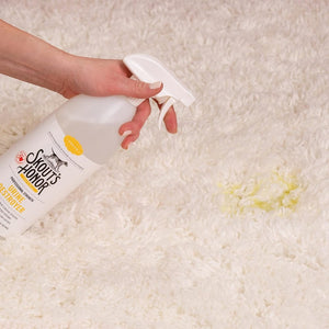 不小心踩到地上一灘暖暖的尿很慘,要用盡一切辦法徹底清潔地板上的尿液更慘!幸好Skout's Honor的除尿味噴霧 採用BioKore™生物分解技術,即時分解最頑固的尿漬,以及破壞臭味物質分子,令家居回復之前的清潔乾淨!所有Skout's Honor的產品均安全無毒,而且可生物降解和不含刺激性物質、氯或甲醛,對環境無害之餘,又能有效去除頑固尿漬。