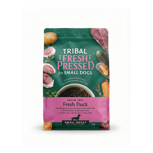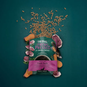 Tribal Fresh Pressed™ Small Breed Duck Adult Dog Food is a grain-free, natural, cold-pressed complete diet, specially developed to meet the nutritional needs of adult small breed dogs. Made with fresh duck as the primary protein source, this recipe combines the benefits of raw feeding with modern nutritional science.