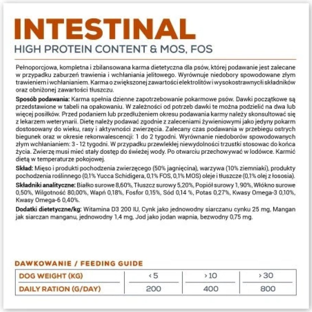 Support your dog’s digestive health with Vet Expert Intestinal Dog Can—a complete and balanced dietary wet food designed for dogs suffering from gastrointestinal disorders, pancreatic insufficiency, or recovering from digestive illness. Safe for both puppies and adult dogs, this formula offers gentle nutrition to aid in recovery and long-term management.
