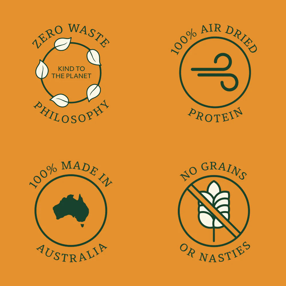 產品不含穀物、填充物或人工添加劑,特別適合對食材敏感或需要簡單飲食的狗狗。所有食材均可追溯來源,並於西澳奧爾巴尼加工及包裝,確保品質與新鮮度。