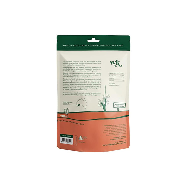 Wildkind 全獵物零食不含穀物、填充物或人工添加劑,特別適合腸胃敏感或需要簡單飲食的狗狗。所有袋鼠均可追溯來源,並於西澳奧爾巴尼加工及包裝,確保品質與新鮮度。