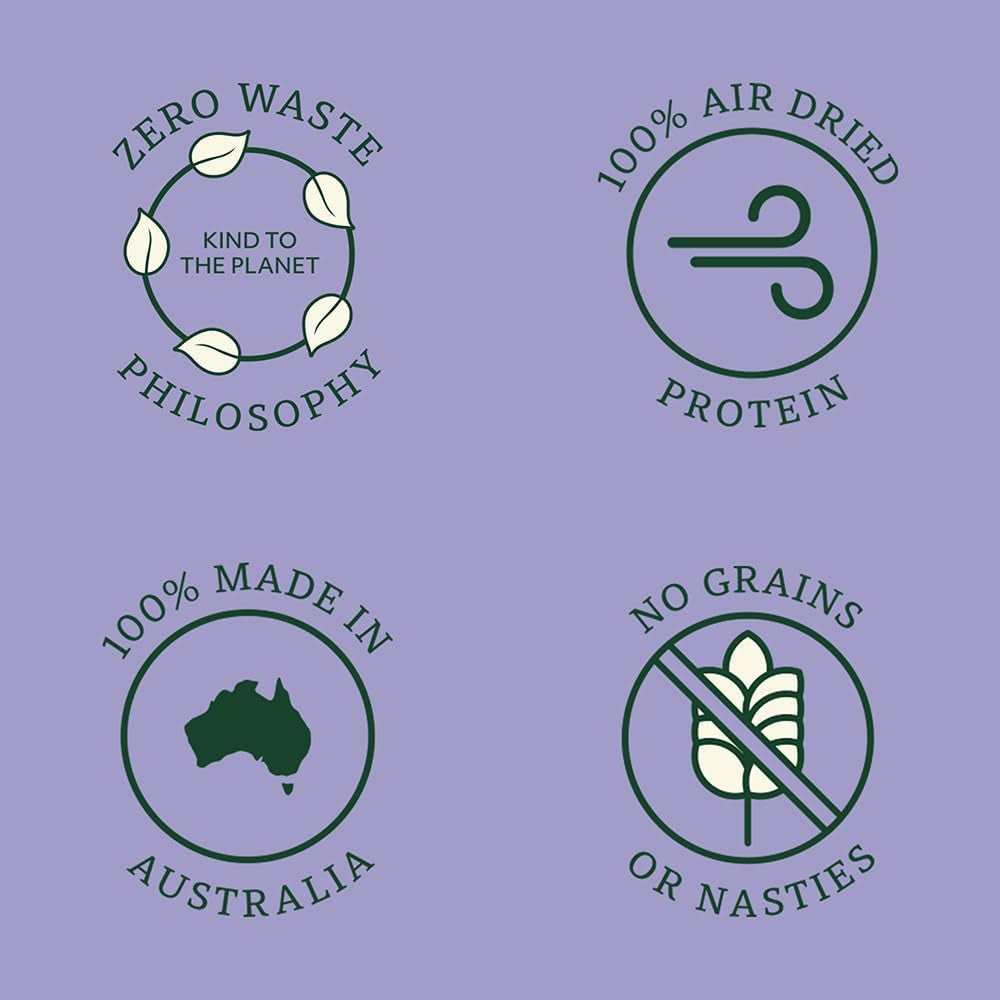 產品不含穀物、填充物或人工添加劑,適合腸胃敏感或需要簡單飲食的狗狗。每一批食材均可追溯來源,並於西澳奧爾巴尼加工及包裝,確保品質與新鮮度。