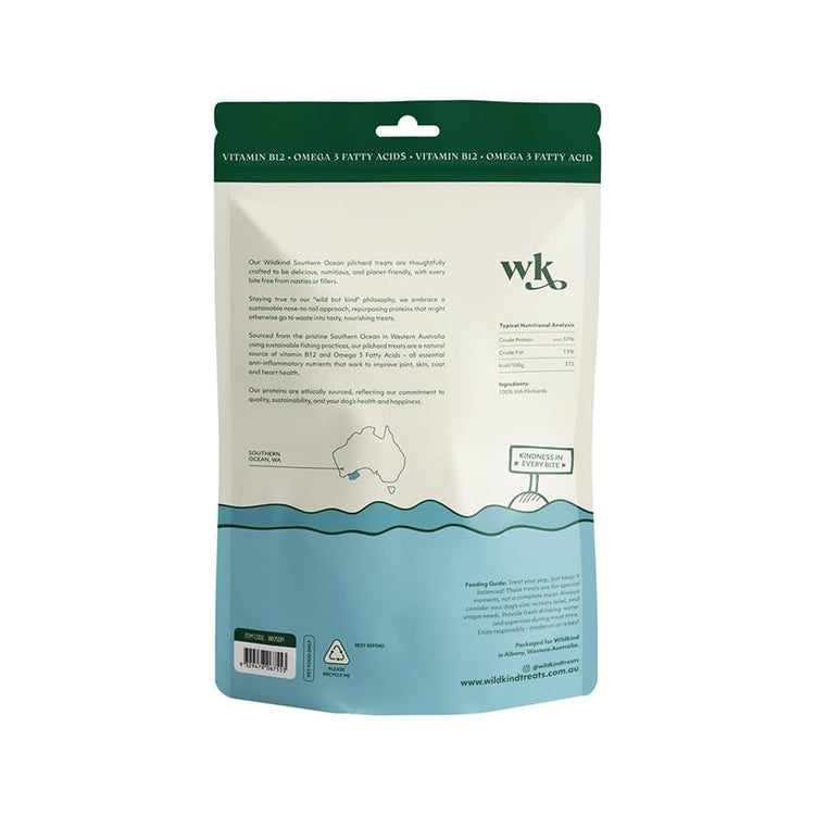 Free from grains, fillers, and artificial additives, Wildkind pilchard treats are ideal for dogs with sensitivities or those on a limited-ingredient diet. All fish are ethically sourced from Western Australian waters, fully traceable, and processed and packed in Albany to ensure premium quality and freshness.