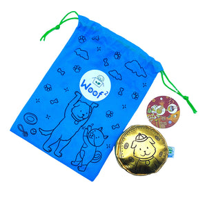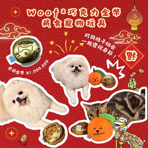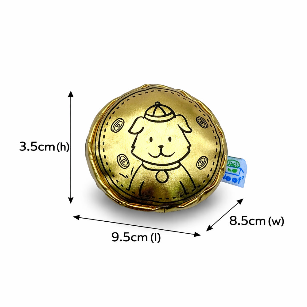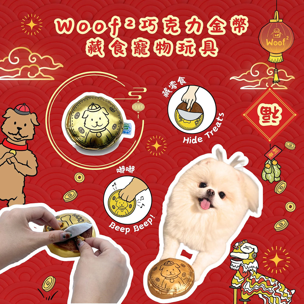 Woof² 朱古力金幣嗅聞訓練寵物玩具以逼真的朱古力金幣造型設計,為狗狗帶來充滿趣味及挑戰性的玩樂體驗。玩具外層設有可撕開的「金色錫紙」,撕開後可見朱古力造型內層,提升探索與互動樂趣。